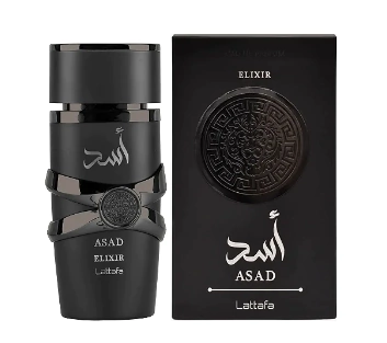 Asad Elixir de Lattafa Perfumes é um perfume Oriental Masculino. Esta é uma nova fragrância. Asad Elixir foi lançado em 2025. As notas de topo são: Pimenta Rosa, Açafrão e Toranja. As notas de coração são: Tabaco, Baunilha e Cedro. As notas de fundo são: Olíbano, Âmbar Claro, Patchouli e Cashmeran.